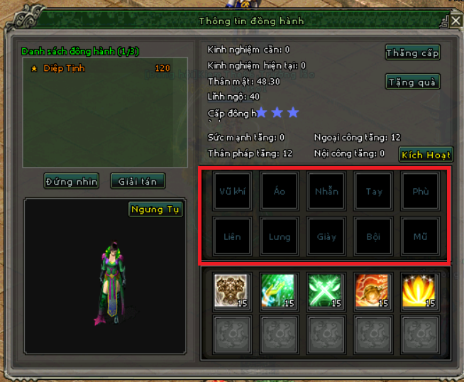 Độ lĩnh ngộ là xác suất tăng điểm kỹ năng cho Bạn Đồng Hành. Ví dụ: Độ lĩnh ngộ 40 đồng nghĩa với mức độ thành công khi tăng điểm kỹ năng là 40.![]() | Để tăng độ lĩnh ngộ cho Bạn Đồng Hành thì phải tặng quà cho Bạn Đồng Hành. Khi chọn nút Tặng quà, hệ thống sẽ hiển thị bảng thông báo để đặt quà tặng vào. Chỉ có thể tặng quà cho Bạn Đồng Hành nào đang được kích hoạt. |