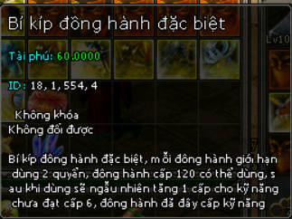 ![]() | Khi vừa thu nhận Bạn Đồng Hành thì đẳng cấp của Bạn Đồng Hành là 1.Muốn có điểm kinh nghiệm cho Bạn Đồng Hành thì phải: Đánh quái Tinh Anh hoặc Thủ Lĩnh (quái Tinh Anh và Thủ Lĩnh chỉ hơn Bạn Đồng Hành 15 cấp trở xuống). Dùng sách tăng kinh nghiệm (đánh quái Tinh Anh ở bản đồ cấp 115 có xác suất rơi ra sách). |