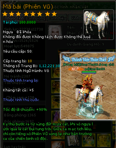 | 2000v Đồng (Giai Đoạn 89) | Danh Hiệu Thành Viên Thân Thiết + Vòng Sáng![]() 1 Lệnh Bài Uy Danh Giang Hồ 3 Túi 24 ô 30 vạn đồng khoá 100 điểm tài phú Tốc độ di chuyển +90% Kháng tất cả +5 Né tránh +5 Thể lực tối đa +90 điểm Sinh lực tối đa 800 điểm |