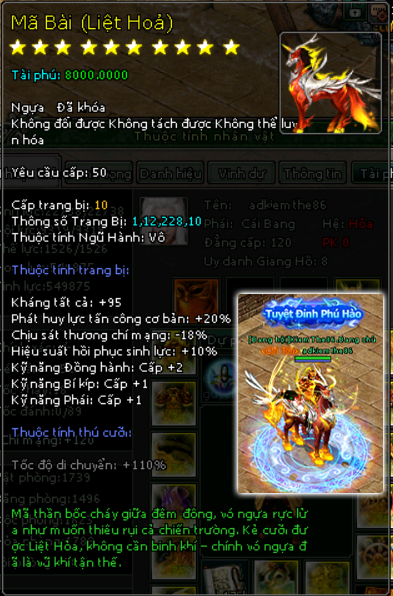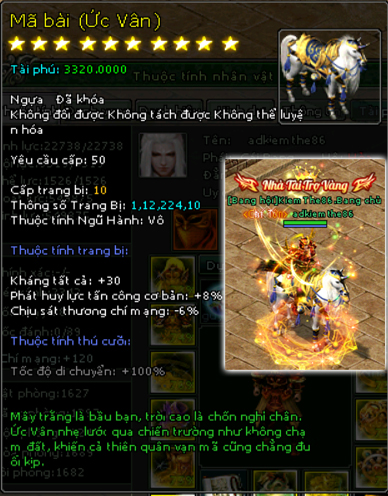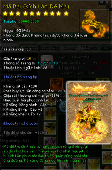 | 72.000v Đồng (Giai Đoạn 119) | Danh Hiệu Nhà Tài Trợ Tuyệt Đỉnh Phú Hào + Vòng Sáng![]() Mở khoá Mã Bài mốc nạp 58.000 vạn 4000 Tiền Du Long ( khoá) 700 vạn đồng khoá 5 Lần Chuyển Cường Hoá 8000 điểm tài phú Tốc độ di chuyển 110% Kháng Tất cả +95 điểm Di hình hoán ảnh + 1 cấp Phát huy lực tấn công cơ bản +20% Chịu sát thương chí mạng -18% Hiệu suất phục hồi sinh lực +10% Kỹ năng đồng hành +2 Kỹ năng bí kíp +1 kỹ năng phái +1 |