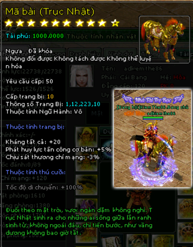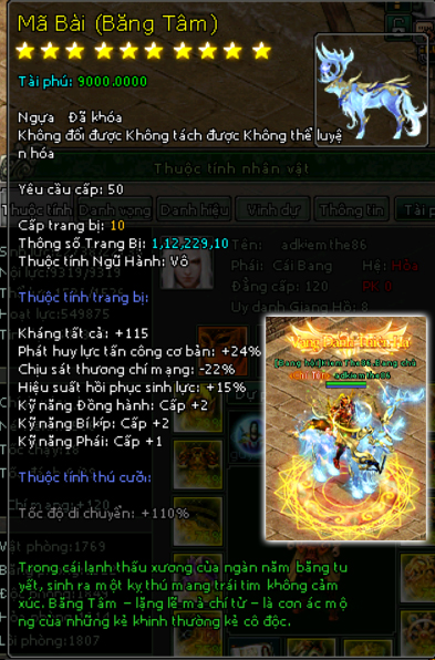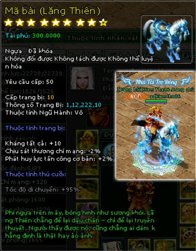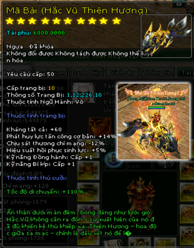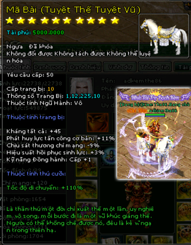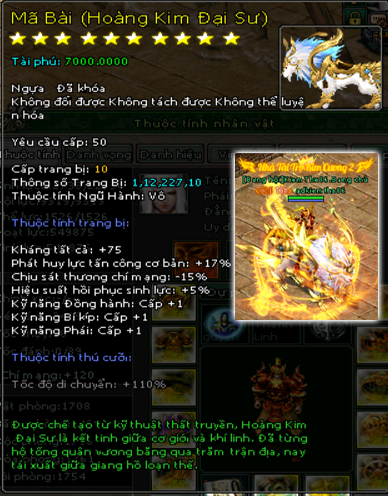 | 58.000v Đồng (Giai Đoạn 109) | Mở khoá Mã Bài mốc 46.000 vạn 2500 Tiền Du Long 600 vạn đồng khoá 3 Lần Chuyển Cường Hoá +7000 điểm tài phú Tốc độ di chuyển +110% Kháng tất cả +75 điểm Di hình hoán ảnh +1 cấp Phát huy lực tấn công cơ bản +17% Chịu sát thương chí mạng -15% Hiệu suất phục hồi sinh lực +5% Kỹ năng đồng hành +1 Kỹ năng bí kíp +1 Kỹ năng phái +1 |