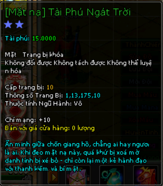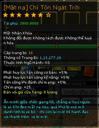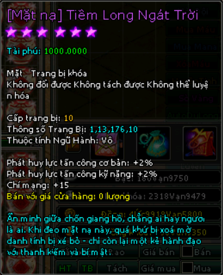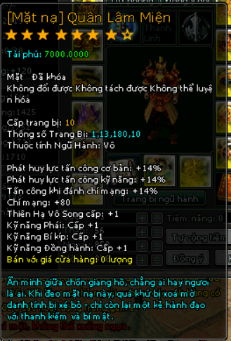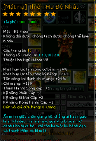 | 10.000v Đồng (Giai Đoạn 89) | Đặc quyền mua mật tịch trung miễn phí Tại Lễ Quan Mở khóa Mặt Nạ mốc 4000 vạn 1000 Tiền Du Long (khóa) 80 vạn đồng khoá 3 Lần Chuyển Cường Hoá + 3000 điểm tài phú Phát huy lực tấn công cơ bản +5% Phát huy lực tấn công kỹ năng +5% Tấn công khi đánh chí mạng +5% Chí mạng +25 |