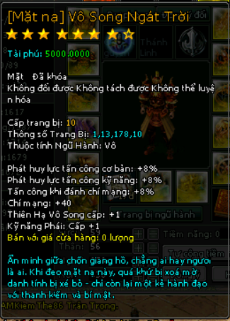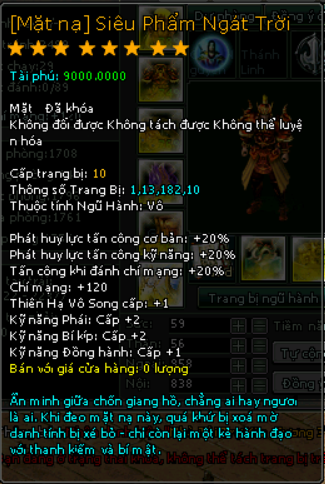 | 18.000v Đồng (Giai Đoạn 99) | Mở khóa Mặt Nạ mốc 10.000 vạn 2000 Tiền Du Long(khóa) 150 vạn đồng khoá 3 Lần Chuyển Cường Hoá +5000 điểm tài phú Phát huy lực tấn công cơ bản +8% Phát huy lực tấn công kỹ năng +8% Tấn công khi đánh chí mạng +8% Kỹ Năng Thiên Hạ Vô Song +1 Chí mạng +40 Kỹ năng phái +1 cấp |