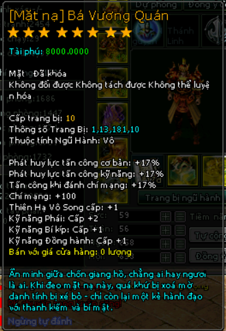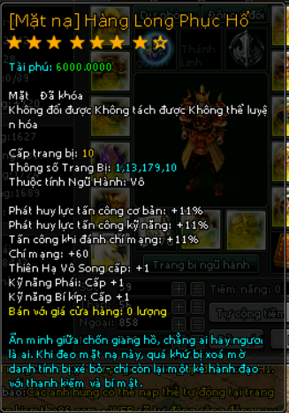 | 28.000v Đồng (Giai Đoạn 99) | Danh Hiệu Nhà Tài Trợ Bạch Kim + Vòng Sáng![]() Mở khóa Mặt Nạ mốc 18.000 vạn 2000 Tiền Du Long (khóa) 200 vạn đồng khoá 3 Lần Chuyển Cường Hoá +6000 điểm tài phú Phát huy lực tấn công cơ bản +11% Phát huy lực tấn công kỹ năng +11% Tấn công khi đánh chí mạng +11% Kỹ Năng Thiên Hạ Vô Song +1 Chí mạng +60 Kỹ năng phái +1 Kỹ năng bí kíp +1 |